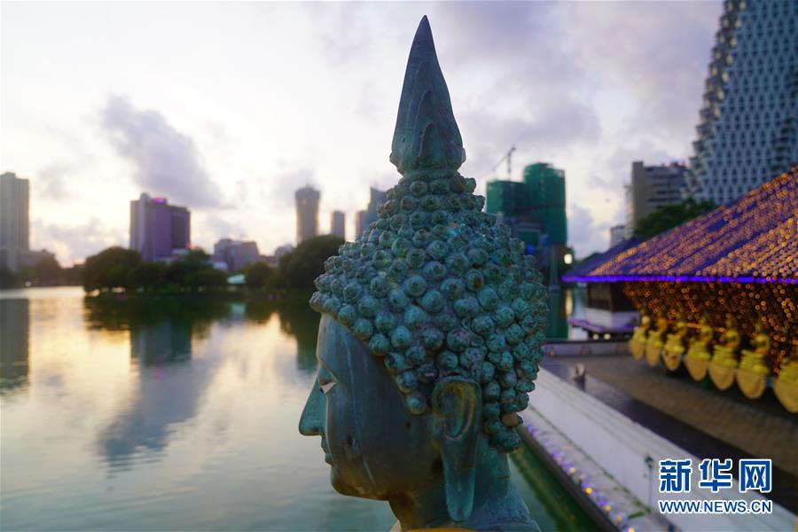 這是夕陽下的斯里蘭卡科倫坡水中廟佛像(5月27日攝)。 在科倫坡貝拉湖上有一座木造樓閣——水中廟。木造建筑上面覆蓋著藍(lán)瓦,外圍環(huán)繞著線條優(yōu)美的佛像。樓閣外高臺(tái)上供奉的佛像,與不遠(yuǎn)處的高層建筑相互映照。祥和寧靜的水中廟已成為人們修心、祈福的重要場所。 新華社記者唐璐攝