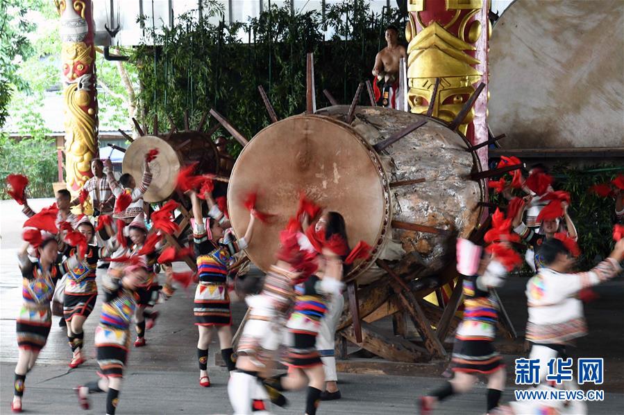 基諾族演員在表演大鼓舞(6月1日攝)。 在云南省西雙版納傣族自治州景洪市基諾山基諾族鄉(xiāng)的基諾族村寨,每天的基諾大鼓舞表演吸引了眾多游客前來觀賞體驗(yàn),帶動了基諾族群眾就業(yè)和增收?;Z族大鼓舞蘊(yùn)涵豐富的歷史文化內(nèi)涵,已被列入國家級非物質(zhì)文化遺產(chǎn)保護(hù)名錄。 新華社記者 楊宗友 攝