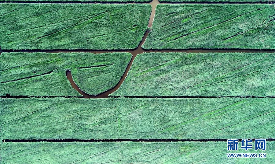 這是天津市寧河區(qū)七里海濕地內(nèi)蘆葦和水面形成的圖案(6月22日無人機(jī)拍攝)。新華社記者 岳月偉 攝