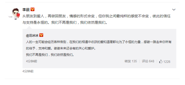 2019年6月27日晚,范冰冰微博發(fā)文宣布跟李晨分手,表示"人的一生可能會經(jīng)歷各種告別,在我們的相遇中收獲的愛和溫暖都化為了永恒的力量,感謝一路走來你所有的給予,支持和愛。謝謝未來還會有的關(guān)心和愛護。我們不再是我們,我們依然是我們。"