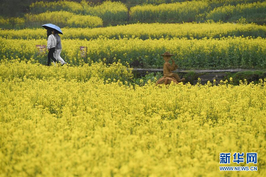 3月6日,游人在四川廣漢市西高鎮(zhèn)的油菜花公園里游玩。 新華社記者劉坤攝
