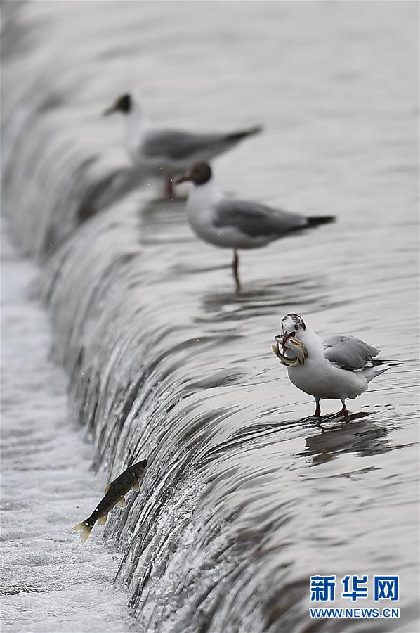 7月6日,在青海省剛察縣沙柳河,棕頭鷗在覓食。 新華社記者 張宏祥攝