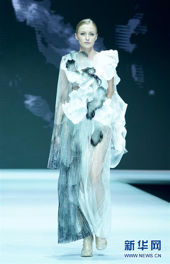 7月7日,模特在展示參賽作品。 當日,首屆“中國皮都杯、辛冬裝”時裝設計大賽在河北省辛集市舉行,吸引了國內(nèi)高等院校、皮革制衣企業(yè)和獨立設計師參賽。 新華社記者 陳建力 攝