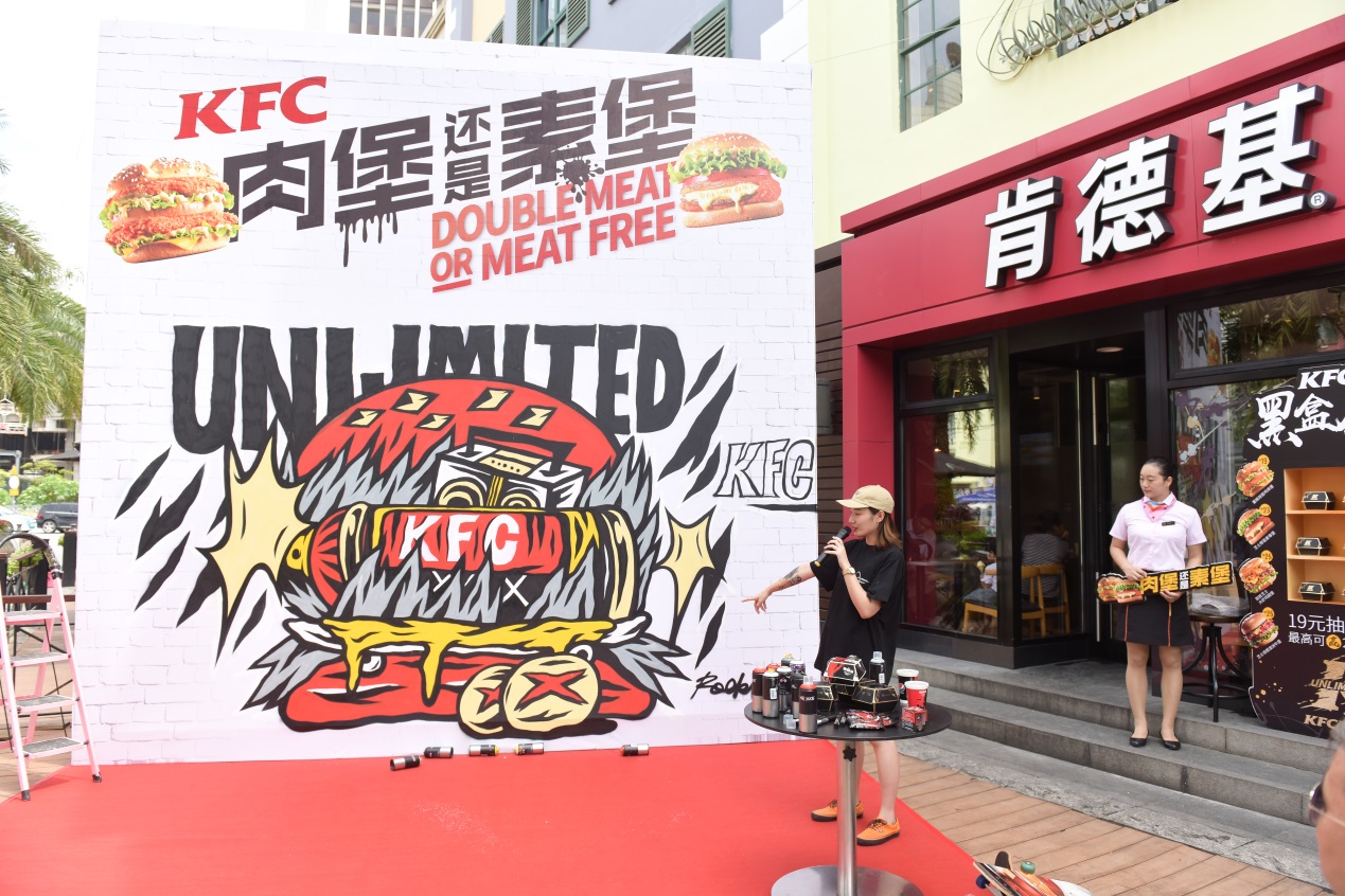 “肯德基是我非常喜歡的品牌,新潮、時尚。這一次與KFC的涂鴉合作,我在漢堡涂鴉的畫面中融入了像滑板、打碟機這樣的潮流元素,來演繹KFC厚菇堡這一款極具創(chuàng)新性的漢堡。用噴漆罐表現(xiàn)一整塊芝士厚菇,一口咬下能噴出濃郁的芝士;火焰燃燒的造型代表漢堡中肆意的醬汁,增加視覺沖擊感,呈現(xiàn)出一個沒有肉,但很real的霸氣素漢堡?!闭劶皠?chuàng)作理念,ROCKLEE說道,“這種結(jié)合我覺得很有意義,一方面展現(xiàn)了涂鴉這種街頭文化多元的一面,另一方面也傳遞出KFC在漢堡界young OG的全新形象?!睆膭?chuàng)作到完工,整個過程都引來路人圍觀、拍照。從朋友圈看到消息的潮人又不斷向此聚集、花式打卡。
