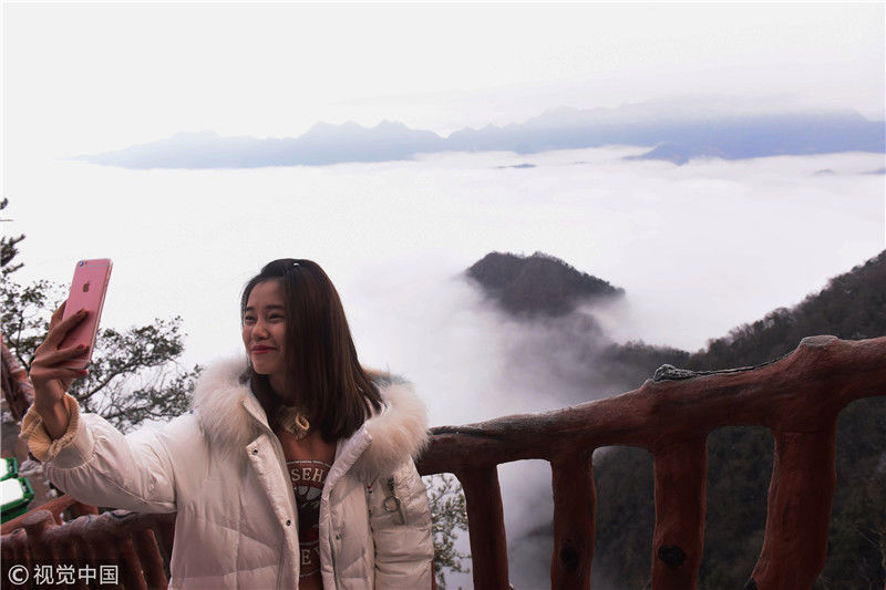 2019年3月3日,陜西商洛,位于鎮(zhèn)安縣的塔云山景區(qū)云海翻騰,宛如仙境。