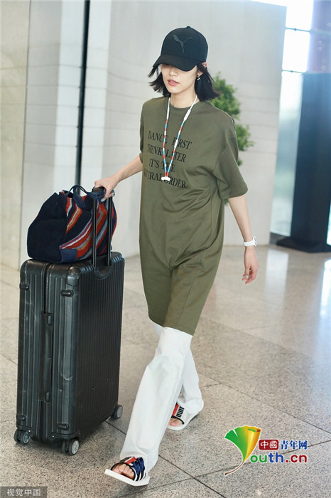 2019年7月23日,北京,劉雯現身機場。她頭戴棒球帽,身穿oversize上衣腳踩拖鞋,走慵懶隨性風,盡顯超模氣場,露出招牌笑容親切又有感染力。