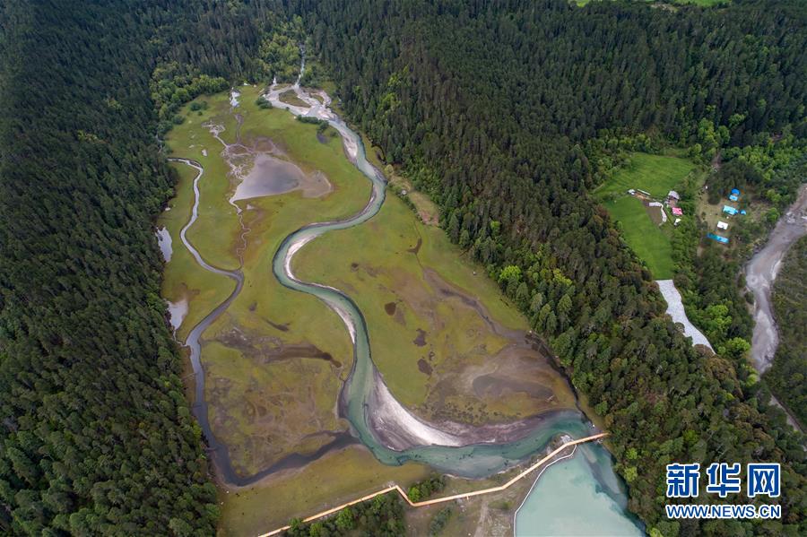 西藏林芝境內(nèi)森林深處的村莊(5月17日無人機拍攝)。