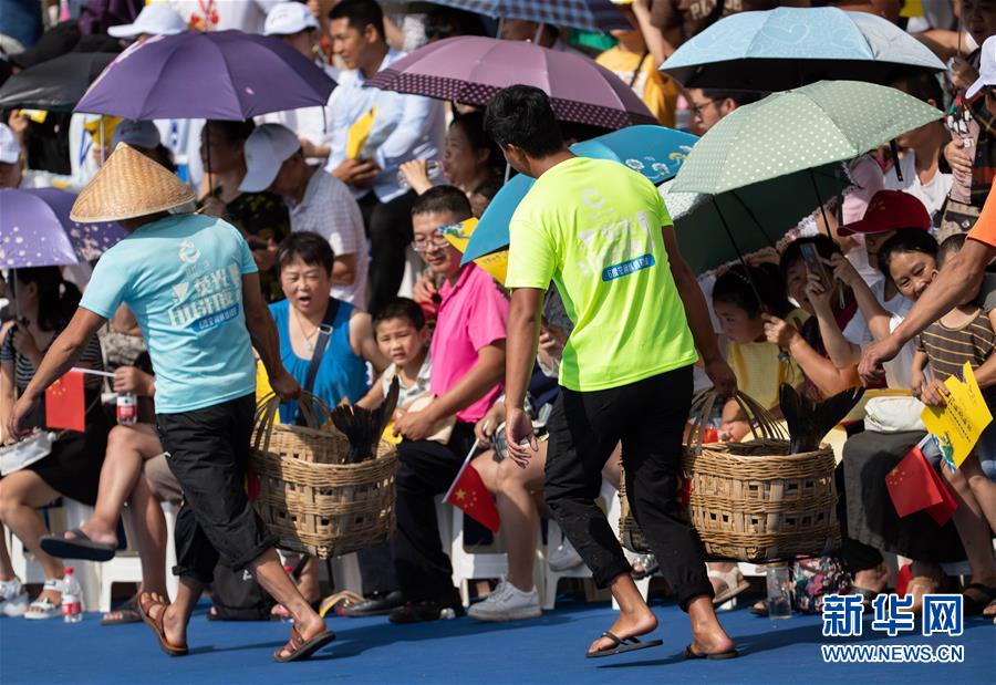 7月27日,在西昌邛海,漁民提著捕到的大魚準備參加比賽。新華社記者江宏景攝