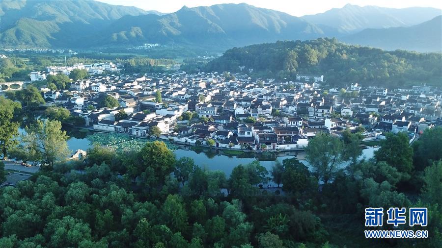 這是8月4日無人機拍攝的安徽黟縣宏村風景區(qū)晨景。