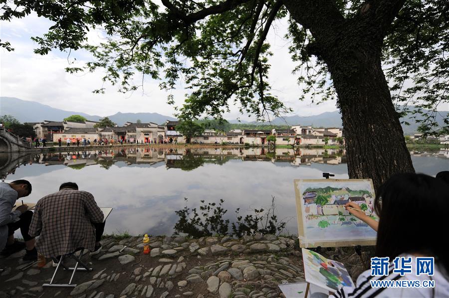 4月24日,繪畫愛好者在宏村風景區(qū)寫生。近日,隨著氣溫升高,位于安徽省黟縣的古村落西遞和宏村春意盎然,景色如畫。大批繪畫愛好者前來寫生,用畫筆描繪古村春色。 新華社記者 任鵬飛 攝