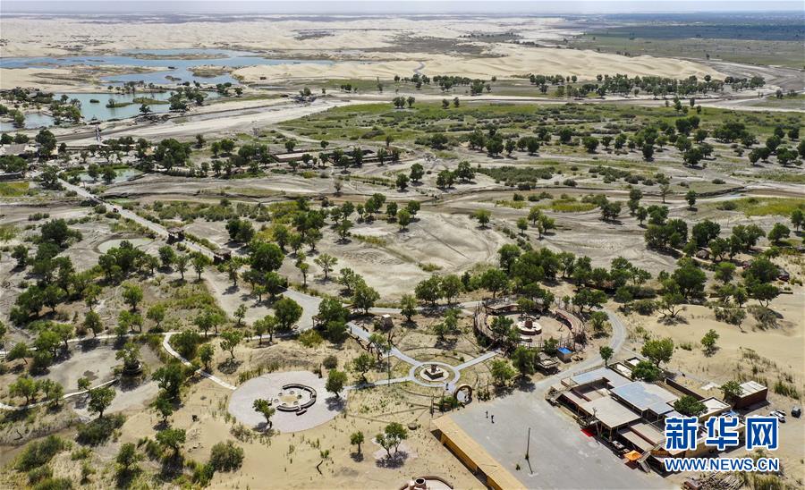 從空中俯瞰位于尉犁縣的羅布人村寨(6月19日無(wú)人機(jī)拍攝)。新華社記者 趙戈 攝