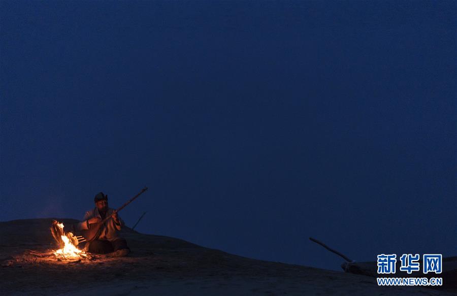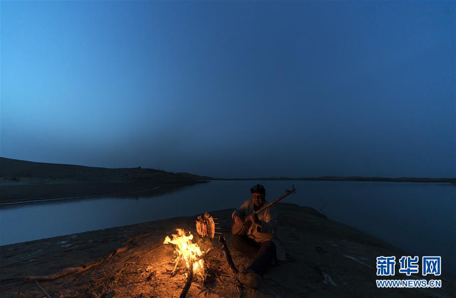 在羅布人村寨,阿木東·艾不東在沙漠里的一處海子旁彈奏樂(lè)器,等待烤魚烤熟(4月11日攝)。新華社記者 趙戈 攝