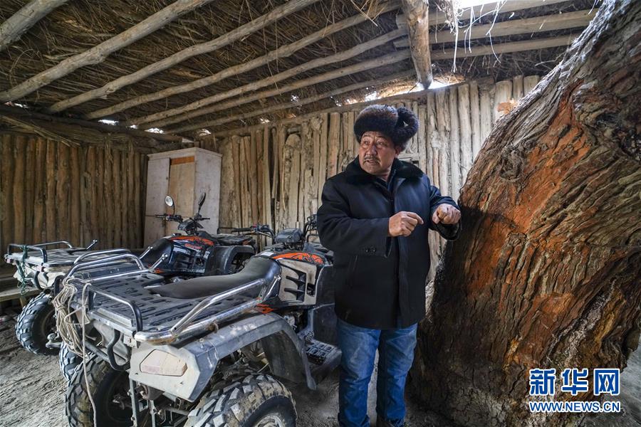 在羅布人村寨,阿木東·艾不東介紹家中的胡楊(1月29日攝)。他準(zhǔn)備將這棵胡楊好好打造一下,吸引更多的游客到來(lái)。新華社記者 趙戈 攝