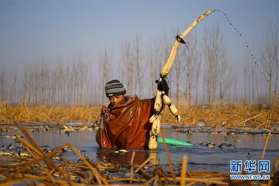 寒冬時節(jié),白洋淀里依然活躍著不少挖藕人,他們身穿橡膠工作服,在冰冷的水中辛勤工作。