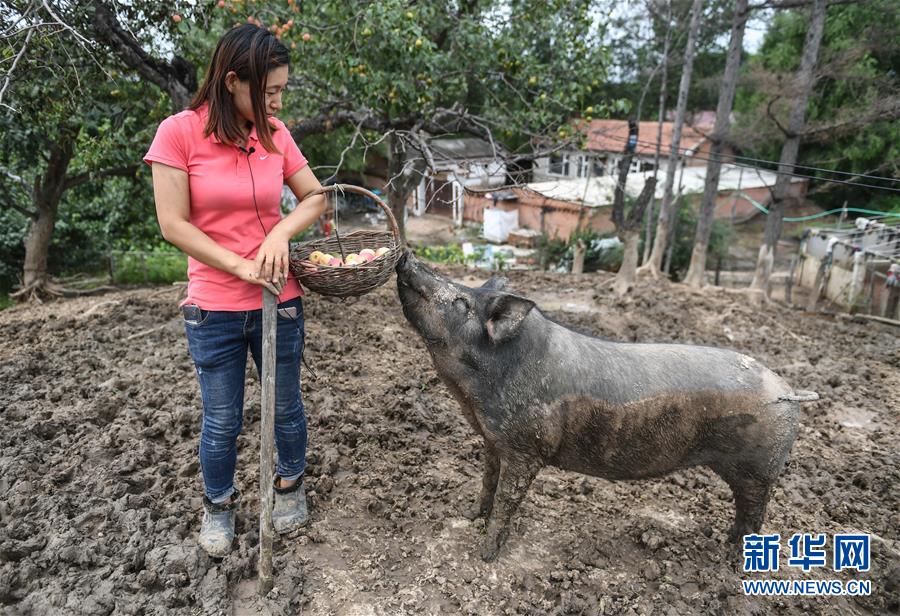 8月20日,康丹丹在接受采訪時,一頭水果香豬來搶食她籃子里的海棠果。新華社記者 王昊飛 攝