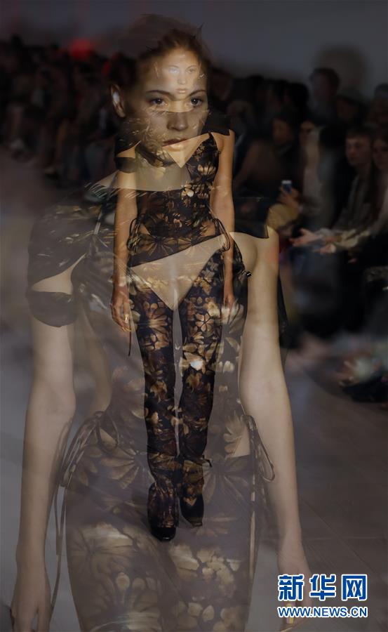 9月17日,在英國倫敦,模特在2020倫敦春夏時裝周上展示Charlotte Knowles品牌服飾(多重曝光)。 當日,2020倫敦春夏時裝周落幕。 新華社記者 韓巖 攝