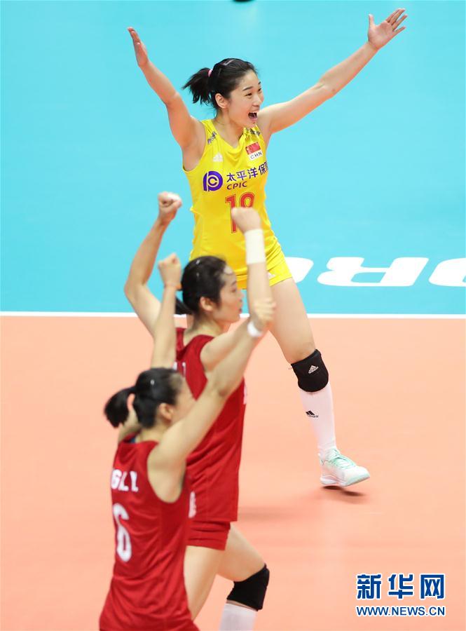 9月23日,中國隊球員在比賽中慶祝得分。當(dāng)日,在日本札幌舉行的2019年女排世界杯賽第二階段A組循環(huán)賽中,中國隊以3比0戰(zhàn)勝美國隊。新華社記者賀燦鈴攝