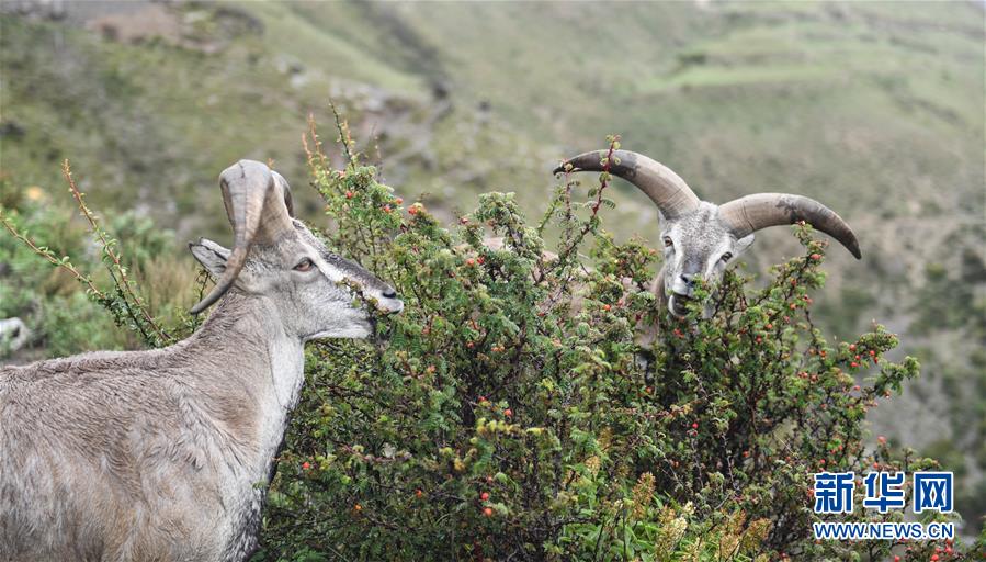 兩只巖羊在西藏山南市洛扎縣色鄉(xiāng)海拔4000米左右的盤山路邊,悠閑地吃著野果青草(9月22日攝)。 在西藏山南市洛扎縣色鄉(xiāng)海拔4000米左右的盤山路上,一群巖羊悠閑地吃著野果青草,完全不介意來往的車輛、行人和近在咫尺的鏡頭。 巖羊是國家二級保護(hù)動物。近年來,隨著西藏生態(tài)保護(hù)力度加大,巖羊數(shù)量不斷增加。 新華社記者 晉美多吉 攝