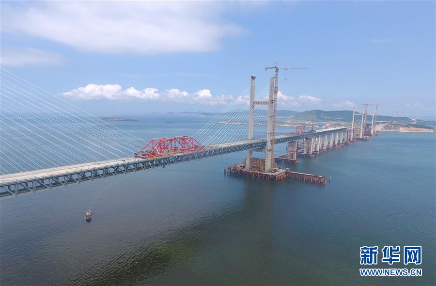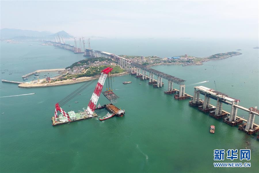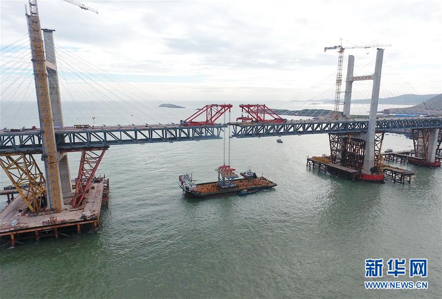 9月21日,平潭海峽公鐵大橋鼓嶼門航道橋的鋼桁梁在吊裝中(無(wú)人機(jī)拍攝)。9月25日上午,隨著一段長(zhǎng)17米、重473噸的鋼桁梁被精確固定到位,總長(zhǎng)16.34公里的平潭海峽公鐵大橋合龍貫通。平潭海峽公鐵大橋是福州至平潭鐵路控制性工程,也是“十三五”規(guī)劃中北京至臺(tái)灣高鐵的先期工程。大橋起于福州市長(zhǎng)樂(lè)區(qū),“踏”過(guò)四座小島后抵達(dá)中國(guó)第五大島平潭,上層設(shè)計(jì)為時(shí)速100公里的六車道高速公路,下層為設(shè)計(jì)時(shí)速200公里的高鐵。據(jù)福建福平鐵路公司介紹,大橋計(jì)劃2020年正式通車。在六年建設(shè)過(guò)程中,平潭海峽公鐵大橋所應(yīng)用研發(fā)的多項(xiàng)技術(shù)、裝備創(chuàng)下國(guó)內(nèi)外紀(jì)錄。新華社記者林善傳攝