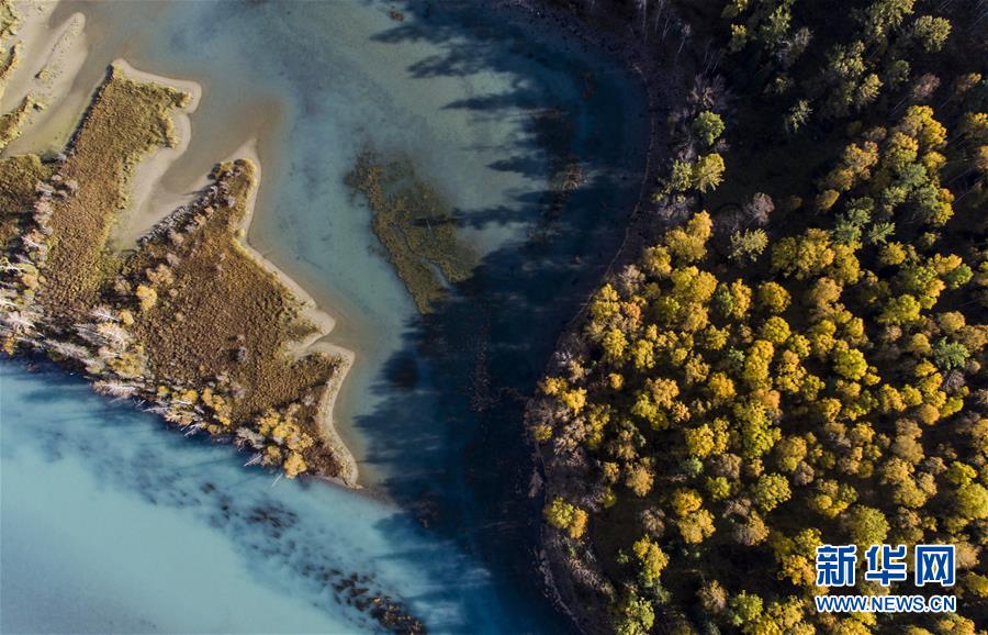 9月24日無人機拍攝的喀納斯景區(qū)風(fēng)光。 新華社記者 王菲 攝