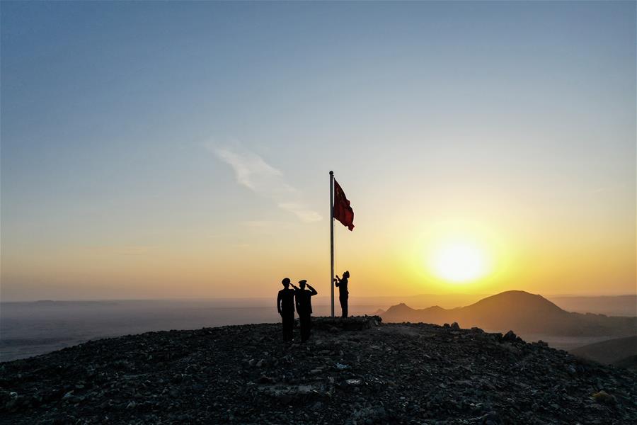 9月27日,內(nèi)蒙古自治區(qū)額濟(jì)納旗算井子邊境派出所民警在大紅山上舉行升國(guó)旗儀式(無(wú)人機(jī)拍攝)。新華社記者劉磊攝