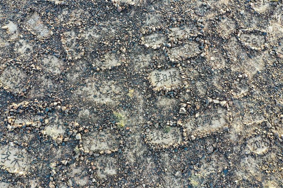 這是內(nèi)蒙古自治區(qū)額濟(jì)納旗算井子邊境派出所民警在大紅山上用石塊擺成的姓名和各種字樣(9月27日無人機(jī)拍攝)。新華社記者劉磊攝
