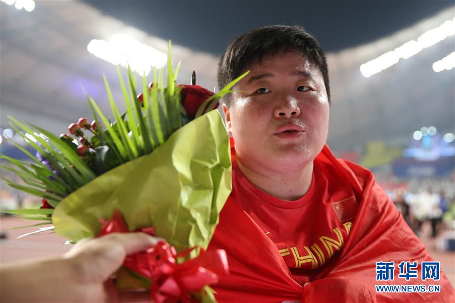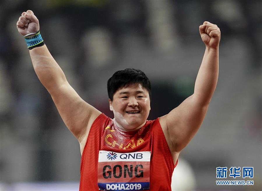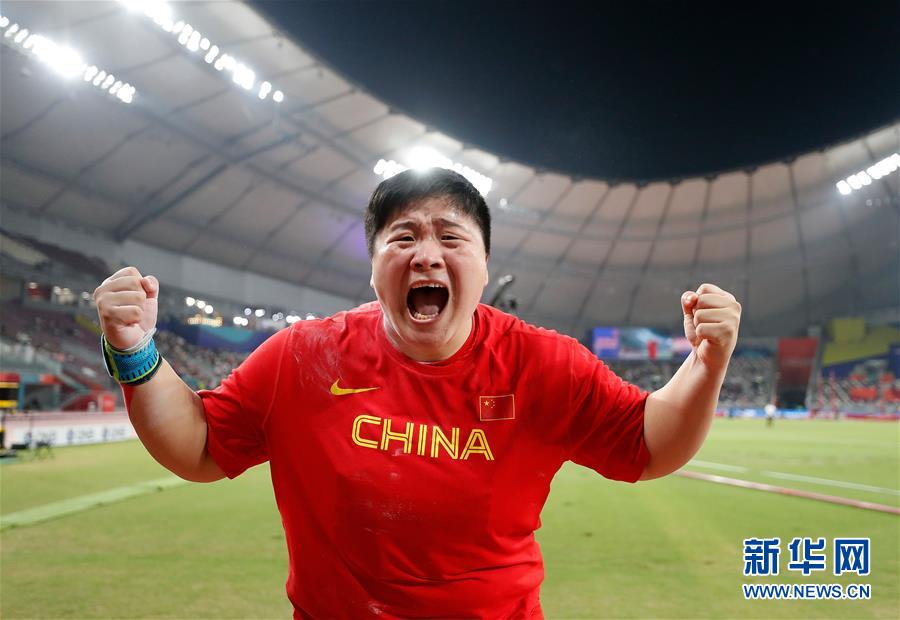 當日,在卡塔爾多哈舉行的2019國際田聯(lián)世界田徑錦標賽女子鉛球決賽中,衛(wèi)冕冠軍、中國選手鞏立姣以19米55的成績奪得冠軍。 新華社記者王麗莉攝