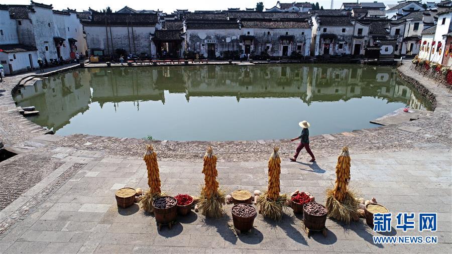 10月5日,新葉古村內(nèi)的“曬秋”美景(無(wú)人機(jī)拍攝)。新華社記者徐昱攝