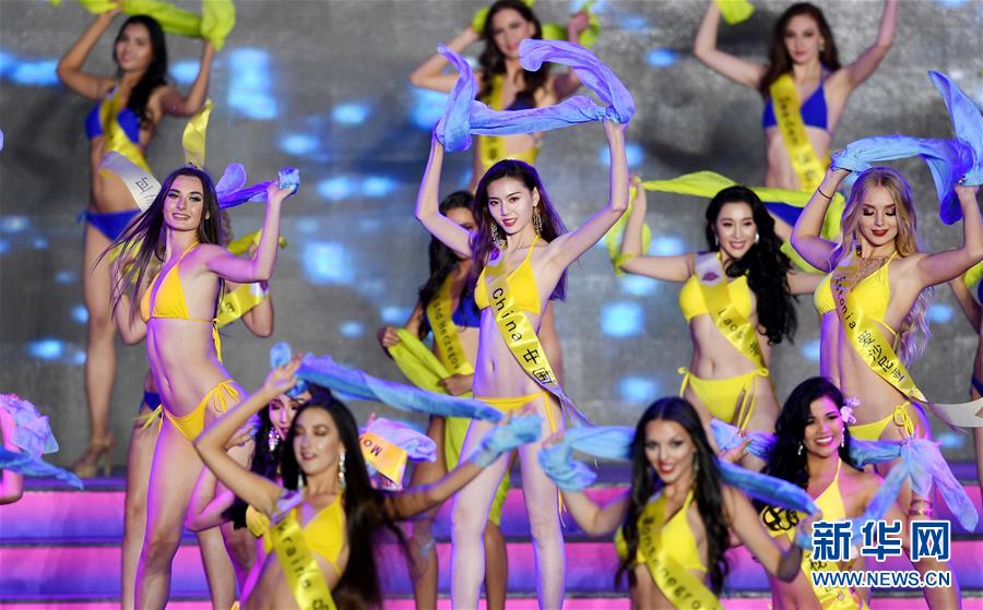 10月6日,中國選手譚若依(中)在泳裝環(huán)節(jié)比賽中亮相。新華社記者 李紫恒 攝