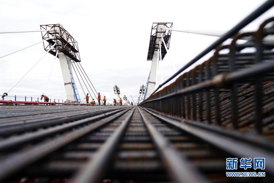 工人在大橋上進行橋面鋪裝施工作業(yè)(8月19日攝)。新華社記者 王建威 攝