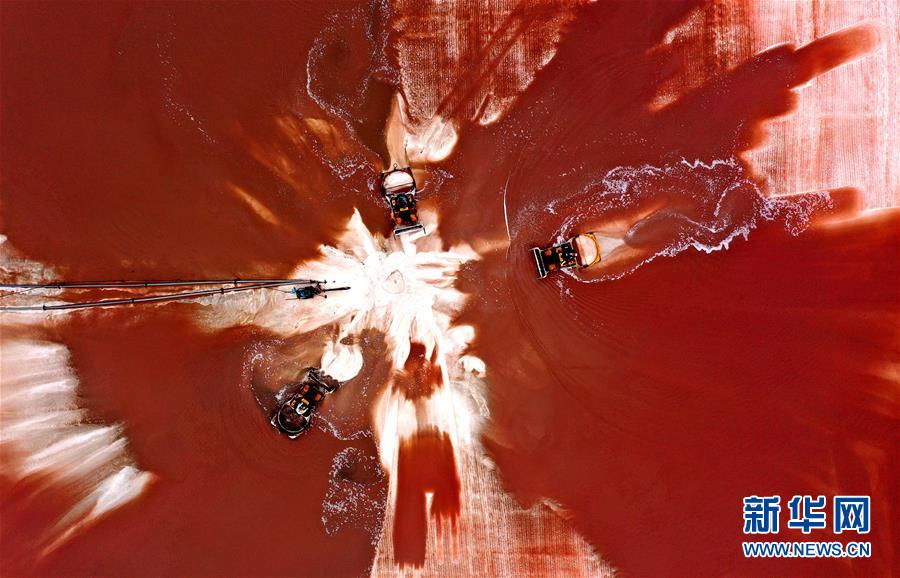 魯北鹽場(chǎng)工人在鹽池中收獲海鹽(10月9日無人機(jī)拍攝)。新華社記者 朱崢 攝