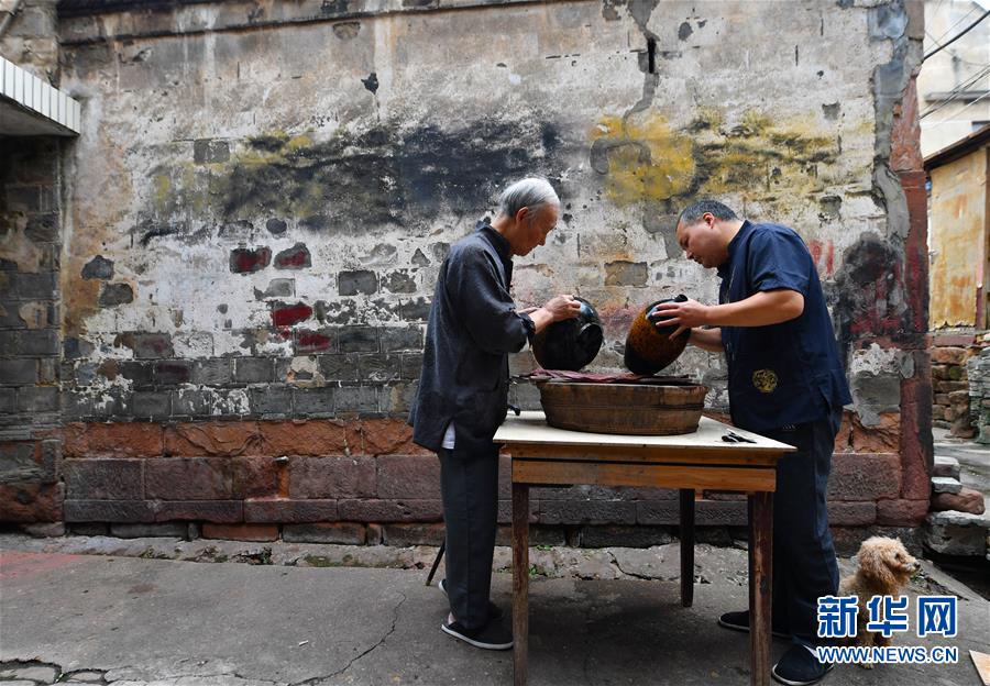 10月12日,丁國坤(左)和徒弟在家門口對未成形的脫胎漆器進行“磨顯”工序。新華社記者胡晨歡攝