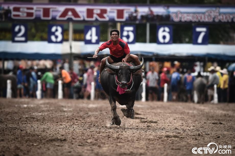 當(dāng)?shù)貢r(shí)間2019年10月12日,泰國(guó)春武里舉行一年一度的水牛賽跑,選手騎??癖?。視覺中國(guó)