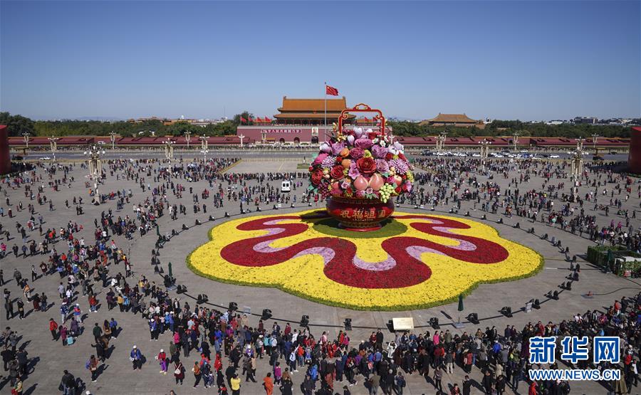 這是10月14日拍攝的天安門廣場中心花壇。 10月14日,以“花果籃”為主造型的天安門廣場中心花壇吸引了眾多游客參觀拍照?!盎ü@”的夜景更是流光溢彩,絢爛迷人。 新華社記者 殷剛 攝