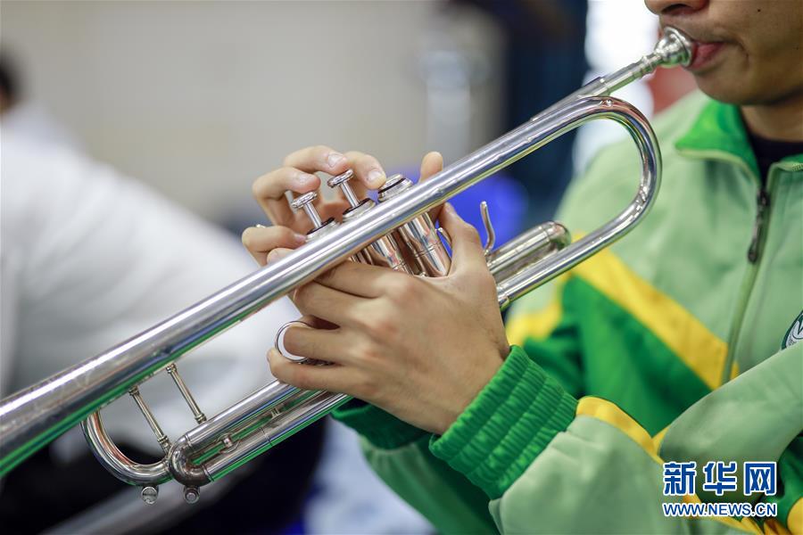 重慶市特殊教育中心排練廳,學(xué)生在排練開始前練習(xí)小號(10月9日攝)。 新華社記者 劉潺 攝