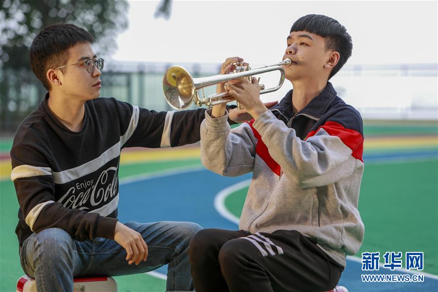 重慶市特殊教育中心的老師李沂念(左一)在教授盲童王太樊練習小號(10月10日攝)。 新華社記者 劉潺 攝