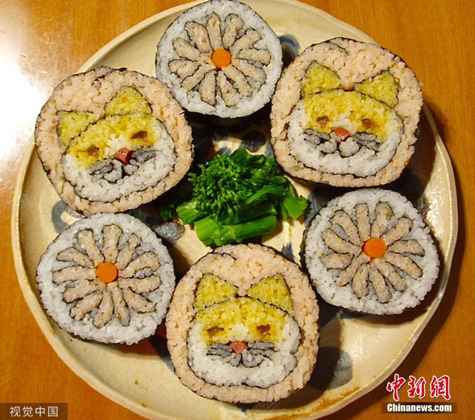 日本壽司廚師利用著色大米和海藻,制作出了貓咪、子宮中的嬰兒、美人魚以及名畫。奇妙的是,不把壽司切成片,就不知道她制作的究竟是什么圖案。圖片來源:視覺中國