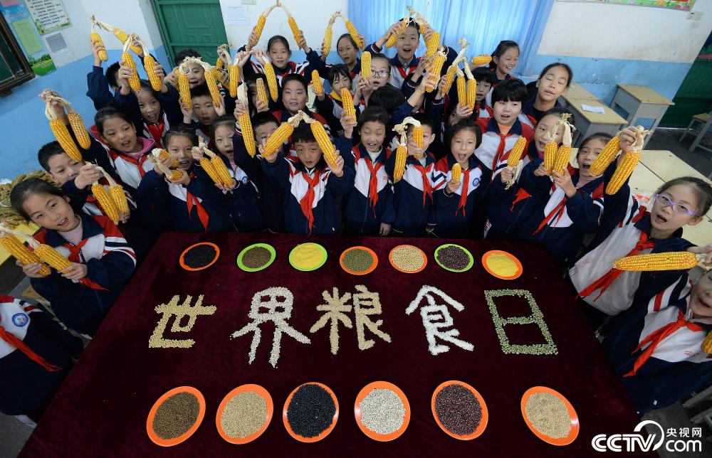 2019年10月15日,河北省邯鄲市邯山區(qū)滏河學校的學生們用糧食作物拼成“世界糧食日”字樣,呼吁大家愛糧節(jié)糧。圖片來源:視覺中國