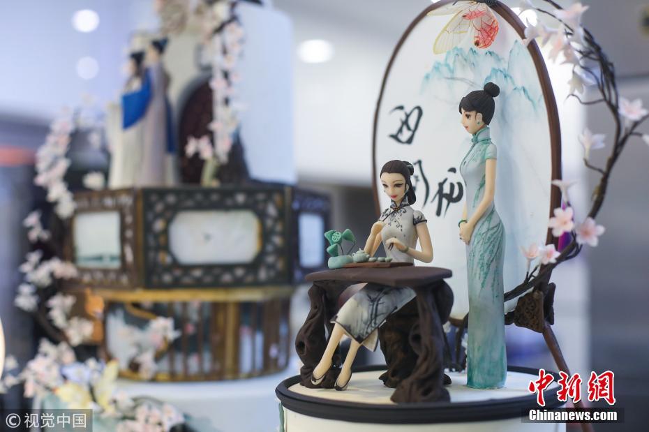 杭州翻糖蛋糕師將白娘子、雷峰塔等杭州文化符號雕刻在翻糖蛋糕上,從最基礎的設計和構思,然后動手制作、調色,最后組裝,濃濃的“中國風”融合舌尖上的甜美藝術,碰撞出了意想不到的火花。圖片來源:視覺中國