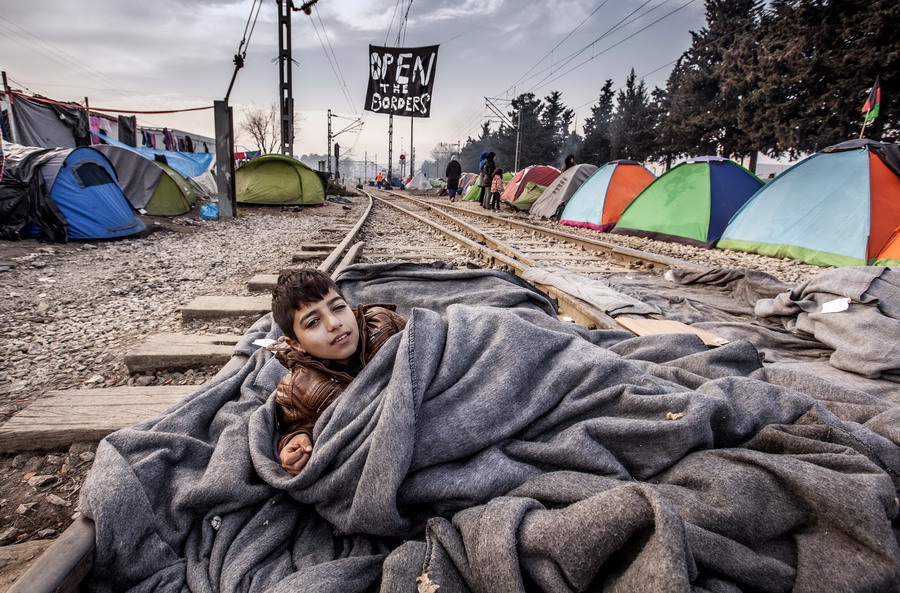 當(dāng)?shù)貢r(shí)間2016年3月22日,希臘伊多梅尼,來自敘利亞阿勒頗的難民男孩躺在鐵軌上睡覺。
