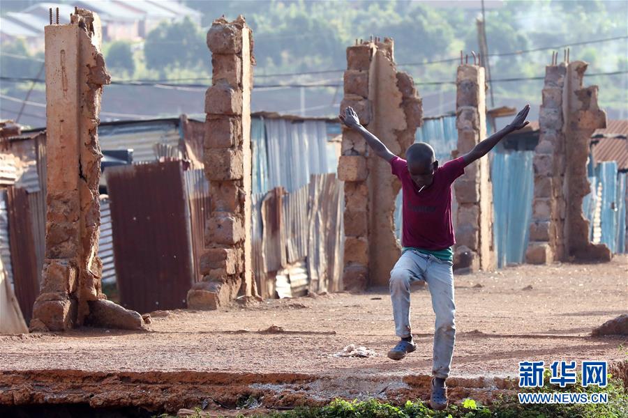 10月16日,在肯尼亞內羅畢基貝拉貧民窟,一名兒童在放學后玩耍。新華社記者王騰攝