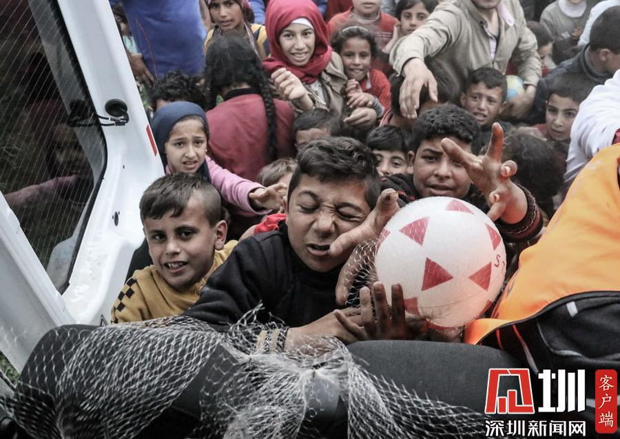 當?shù)貢r間2018年3月18日,敘利亞阿勒頗,敘利亞難民領取災害和應急管理機構提供的糧食救援。1月20日,土耳其發(fā)動針對敘利亞阿夫林地區(qū)庫爾德人的橄欖枝行動,阿勒頗諸多村鎮(zhèn)被清理,當?shù)鼐用窦毙枞粘I罹仍?/p>