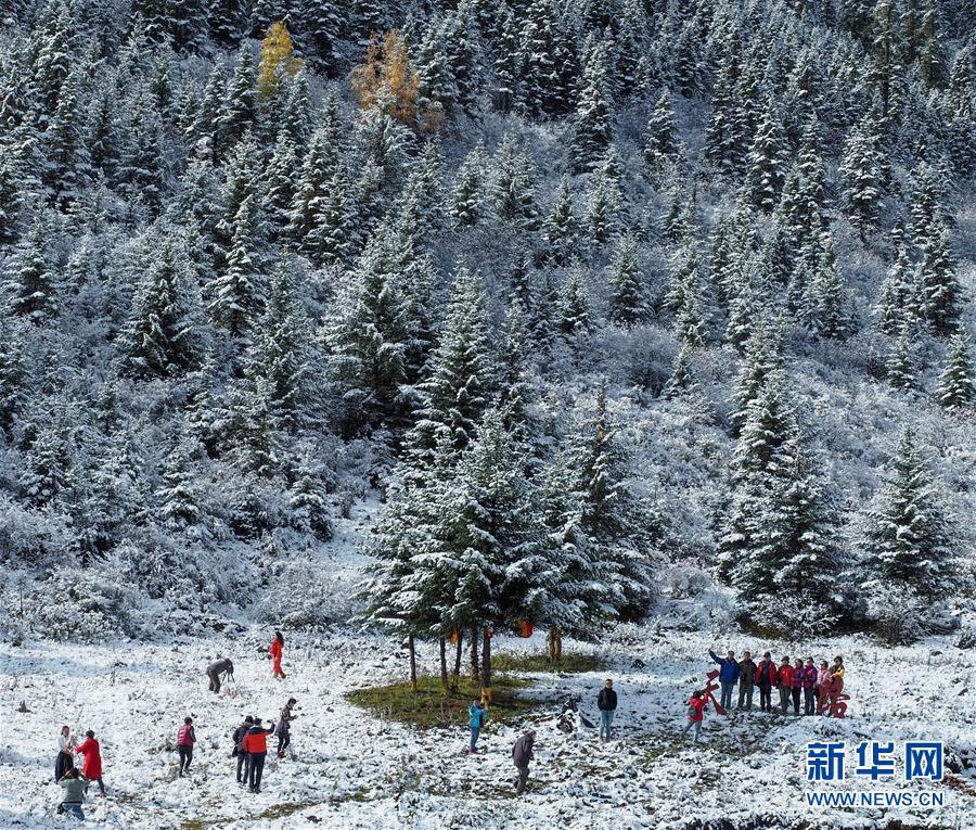 10月17日,在川藏線高爾寺山至理塘路段,部分游客在一個(gè)路邊觀景臺(tái)附近拍照留念。當(dāng)日,一場(chǎng)夜雪后,川藏線高爾寺山至理塘路段披上了一層銀裝。雪山、牦牛、云朵、松林,帶來了濃濃的雪域風(fēng)情。 新華社記者 王迪 攝