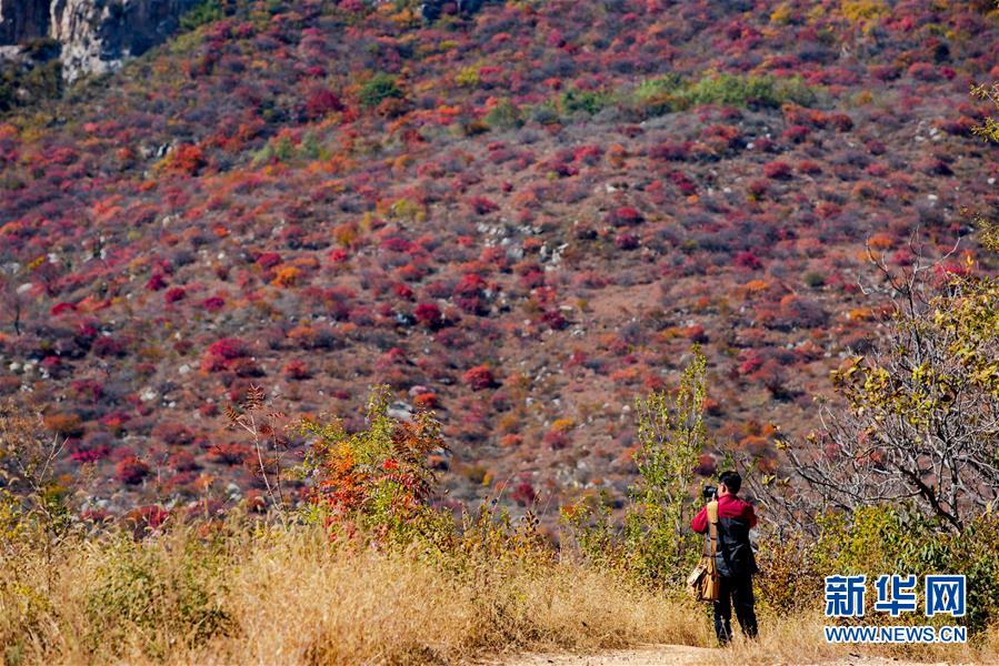 10月24日,游客在河北省武安市賀進鎮(zhèn)后臨河村拍攝紅葉。新華社記者王曉攝