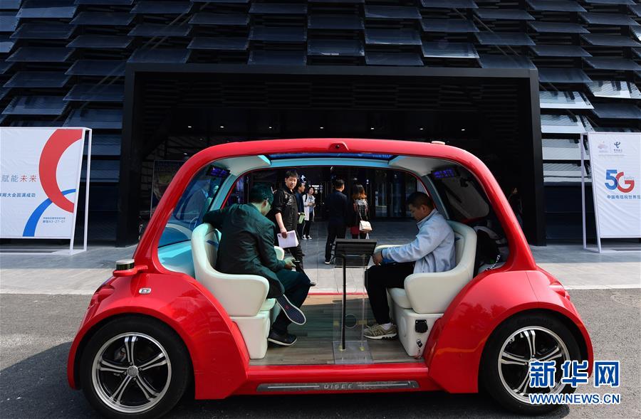 10月21日在浙江烏鎮(zhèn)舉行的互聯(lián)網(wǎng)之光博覽會會場外拍攝的5G無人駕駛體驗(yàn)車。新華社記者尹棟遜攝