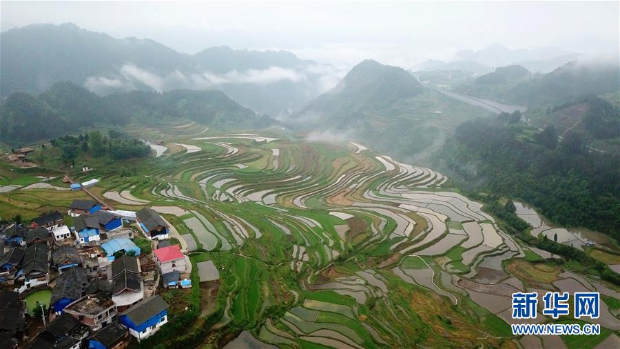 這是5月18日無人機(jī)拍攝的貴州省丹寨縣龍泉鎮(zhèn)高要梯田景色。初夏時(shí)節(jié),位于貴州省丹寨縣龍泉鎮(zhèn)的高要梯田景色優(yōu)美。新華社記者楊文斌攝