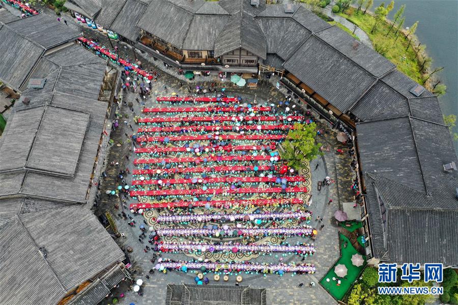 丹寨縣萬(wàn)達(dá)小鎮(zhèn)“萬(wàn)人長(zhǎng)桌宴”(10月26日無(wú)人機(jī)拍攝)。新華社記者歐東衢攝