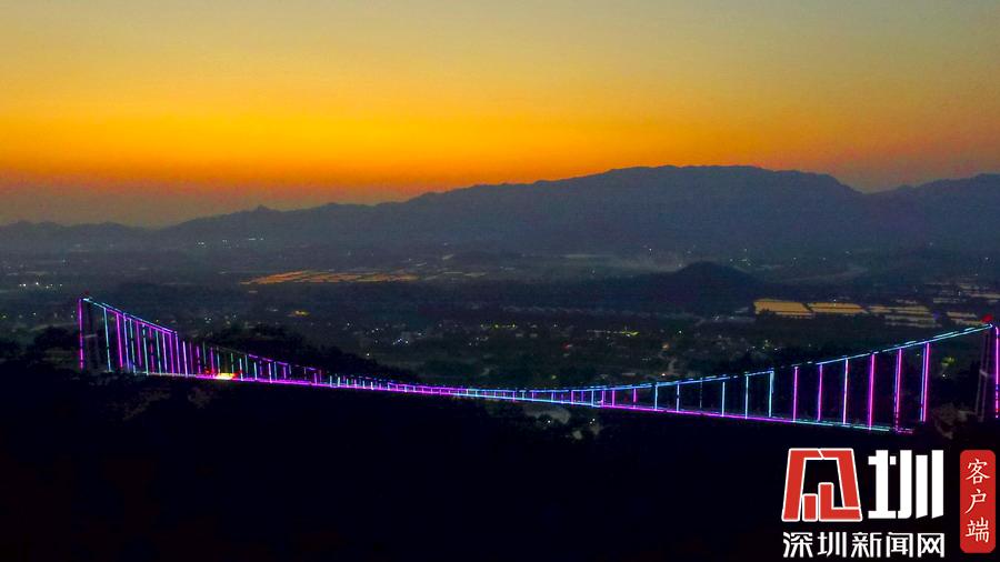 2018年10月7日,廣東佛山。網友紛紛稱佛山南丹山玻璃橋是廣東最美玻璃橋。漸漸地,金燦燦的陽光變?yōu)榱顺赛S色,開始變得柔和,嫵媚動人,給美麗恬靜的群山抹上一層金光。太陽開始脫去華麗的金絲紗裙,換上了橘黃色的時尚。玻璃橋也穿上了端莊典雅的晚禮服,露出那像蒙娜麗莎一樣迷人的笑容。