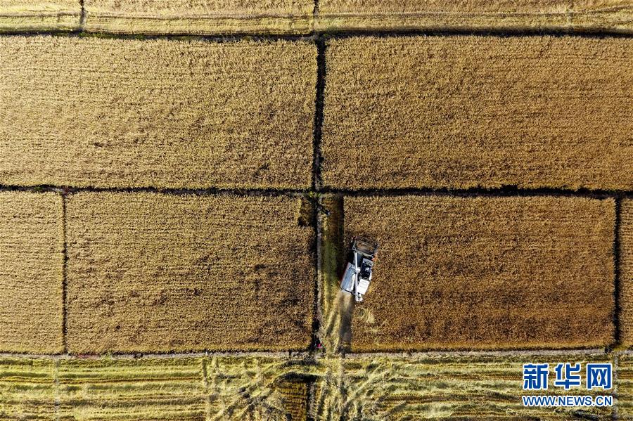 收割機(jī)在太原市晉源區(qū)赤橋村稻田里作業(yè)(10月28日無(wú)人機(jī)拍攝)。新華社記者詹彥攝