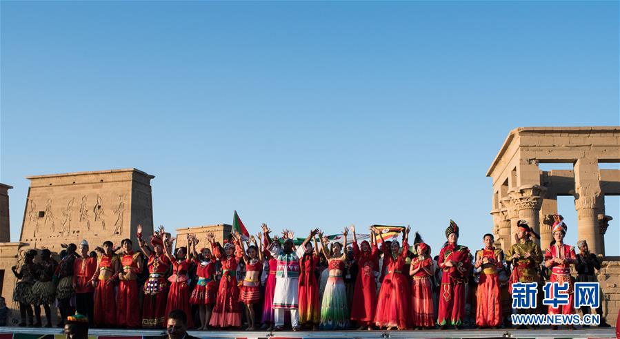 10月27日,來自福建省廈門市的小白鷺民間舞團(tuán)的演員在位于埃及阿斯旺的菲萊神廟表演。 新華社記者 鄔惠我 攝